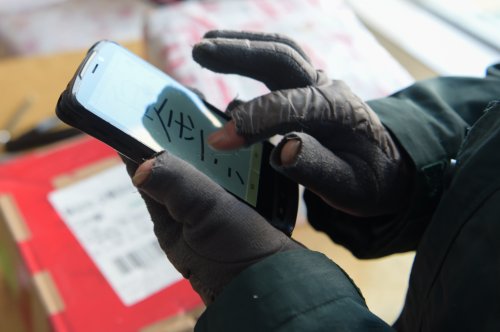 每天上午八點(diǎn)半,韓金花就開始工作,要一直忙碌到天黑。為了御寒,韓金花提前準(zhǔn)備了暖足貼,外出工作時(shí)貼到腳上。她在手套的拇指與食指部分剪了洞,露出手指,方便在設(shè)備中錄入快遞信息。寒冬里,手指經(jīng)常凍得失去知覺?!敖衲?0月份我就要退休了,我要站好最后一班崗?!彼f。