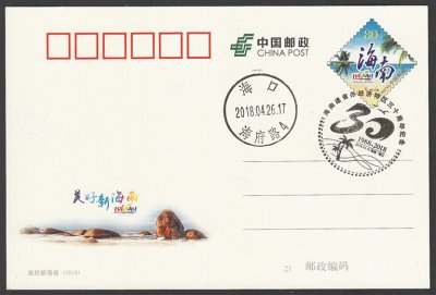 為慶祝海南建省辦經(jīng)濟(jì)特區(qū)30周年,2018年中國郵政發(fā)行了《美好新海南》普通郵資信封、普通郵資明信片,郵資圖都印有海南旅游徽志。