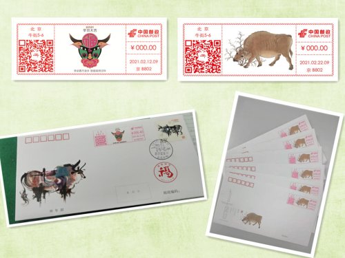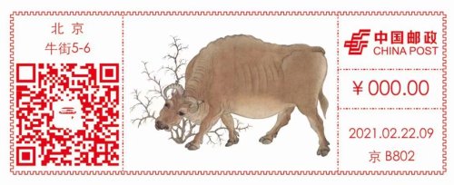 2月22日是辛丑年第一個辛丑日,北京郵政啟用了第一枚《五牛圖》郵資機彩色宣傳戳,并首次嘗試郵資機宣傳戳產(chǎn)品線上定時寄預約實寄服務。