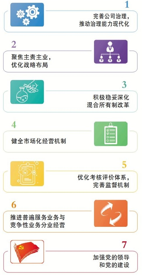 2.七個方面重點(diǎn)改革任務(wù)?!秾?shí)施方案》根據(jù)中國郵政改革落地過程中遇到的重點(diǎn)難點(diǎn)問題,提出:一是完善公司治理,推動治理能力現(xiàn)代化,全面貫徹“兩個一以貫之”,把黨的領(lǐng)導(dǎo)融入公司治理各環(huán)節(jié),實(shí)現(xiàn)制度化、規(guī)范化、程序化,加強(qiáng)董事會建設(shè),落實(shí)董事會職權(quán),保障經(jīng)理層依法行權(quán)履職,開展對標(biāo)世界一流企業(yè)管理提升行動,加強(qiáng)各類風(fēng)險(xiǎn)管控,完成子企業(yè)公司制改制。二是聚焦主責(zé)主業(yè),優(yōu)化戰(zhàn)略布局,圍繞服務(wù)國家戰(zhàn)略,構(gòu)筑中國郵政高質(zhì)量發(fā)展的“四梁八柱”,推動普遍服務(wù)能力提升,推動寄遞業(yè)務(wù)核心競爭力提升,推動郵儲銀行高質(zhì)量發(fā)展,推動代理金融轉(zhuǎn)型發(fā)展,推動中郵保險(xiǎn)價值發(fā)展,推動農(nóng)村電商生態(tài)圈建設(shè),推動惠農(nóng)合作項(xiàng)目協(xié)同發(fā)展,推動資產(chǎn)重組與盤活,推動自主創(chuàng)新能力提升,清理退出不具備競爭優(yōu)勢的非主營業(yè)務(wù)和低效無效資產(chǎn),完成剝離國有企業(yè)辦社會職能,解決歷史遺留問題。三是積極穩(wěn)妥深化混合所有制改革,把握好改革方向,務(wù)求改革實(shí)效,避免盲目性,避免一混了之。按照完善治理、強(qiáng)化激勵、突出主業(yè)、提高效率的要求,堅(jiān)持因地施策、因業(yè)施策、因企施策,宜獨(dú)則獨(dú)、宜控則控、宜參則參,分層分類深化混合所有制改革,穩(wěn)慎開展混合所有制企業(yè)骨干員工持股,推動混合所有制企業(yè)深度轉(zhuǎn)化經(jīng)營機(jī)制,加強(qiáng)對混合所有制改革全過程的監(jiān)督,防止國有資產(chǎn)流失。四是健全市場化經(jīng)營機(jī)制,強(qiáng)化各層級郵政企業(yè)、控股子公司市場主體地位,切實(shí)深化勞動、人事、分配三項(xiàng)制度改革,推行經(jīng)理層成員任期制和契約化管理,全面推進(jìn)用工市場化,完善市場化薪酬分配機(jī)制,穩(wěn)慎開展控股子公司中長期激勵。五是優(yōu)化考核評價體系,完善監(jiān)督機(jī)制,完善戰(zhàn)略績效考核評價體系,健全協(xié)同高效的監(jiān)督機(jī)制。六是認(rèn)真貫徹落實(shí)《關(guān)于新時代加快完善社會主義市場經(jīng)濟(jì)體制的意見》要求,推進(jìn)普遍服務(wù)業(yè)務(wù)與競爭性業(yè)務(wù)分業(yè)經(jīng)營。七是加強(qiáng)黨的領(lǐng)導(dǎo)和黨的建設(shè),加強(qiáng)黨的政治建設(shè),推進(jìn)黨建工作與生產(chǎn)經(jīng)營深度融合,加強(qiáng)領(lǐng)導(dǎo)班子建設(shè)和人才隊(duì)伍建設(shè),激勵領(lǐng)導(dǎo)人員擔(dān)當(dāng)作為,持續(xù)深入推進(jìn)全面從嚴(yán)治黨。