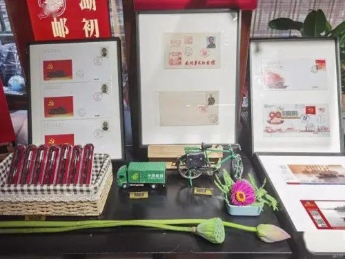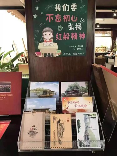 南湖初心郵局設(shè)立于煙雨樓前“南湖1921文創(chuàng)專營(yíng)商店”,紅彤彤的郵政信筒上面印有“南湖初心郵局”字樣,精心布置的紅色文化展臺(tái)、琳瑯滿目的紅色題材郵品令人耳目一新。