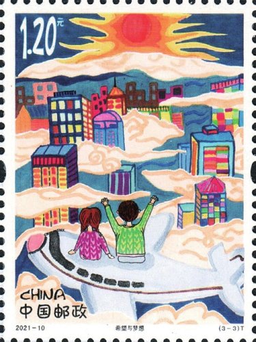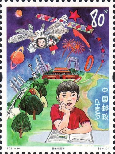 登上《兒童畫作品選》特種郵票的3幅作品“我的中國夢”“國粹之韻”和“希望與夢想”,分別由上海市同濟(jì)小學(xué)的楊曉芒、合肥新站壽春實驗中學(xué)的費(fèi)玉婷、上海市周浦第三小學(xué)的錢昕逸3位小朋友設(shè)計。第一枚通過描繪我國航空航天事業(yè)、城市、交通網(wǎng)絡(luò)繁榮發(fā)展等場景,表達(dá)了少年兒童不斷追尋探索宇宙的夢想以及對未來美好生活的憧憬;第二枚描繪了傳統(tǒng)文化與城市發(fā)展、現(xiàn)代科技共繁榮的場景,表達(dá)了少年兒童對中華優(yōu)秀文化的熱愛與傳承;第三枚描繪了偉大祖國不斷發(fā)展的場景,少年兒童登高望遠(yuǎn)、憧憬未來。三枚郵票緊密圍繞主題,展現(xiàn)出少年兒童對黨領(lǐng)導(dǎo)下的偉大祖國的無比熱愛、由衷禮贊和美好祝愿。