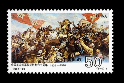 1996年10月22日,為了宣揚中國工農(nóng)紅軍二萬五千里長征精神,《中國工農(nóng)紅軍長征勝利六十周年》紀念郵票發(fā)行。全套郵票共2枚,圖案分別采用了一組群雕《過草地》和一幅油畫《三軍大會師》。