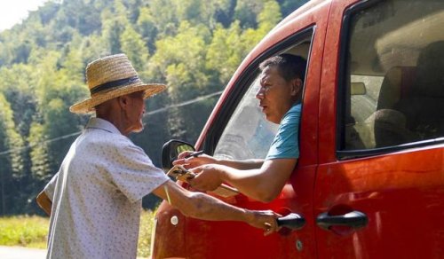 10月6日,雙峰郵政所的郵遞員吳文清(左)將貨物送給一名在田間勞作的村民手中。