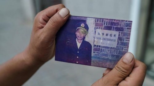 10月6日,雙峰郵政所的郵遞員吳文清展示當(dāng)年父親身穿郵遞員制服的照片。