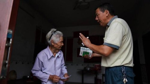 10月6日,雙峰郵政所的郵遞員吳文清(右)向一名訂購藥品的村民講解使用方法。