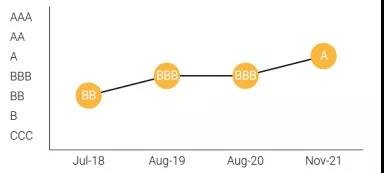 郵儲銀行2018-2021年MSCI ESG評級提升情況,圖片來源:MSCI ESG報告