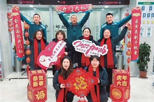 喜氣洋洋辭舊歲,虎虎生威迎新年。新年伊始,中國郵政廣大員工意氣風發(fā)、豪情滿懷,全力開展業(yè)務旺季開門紅活動,大步邁進推動企業(yè)高質量發(fā)展的新征程。在推進代理金融業(yè)務發(fā)展中,重慶市萬州片區(qū)郵政分公司定下了一個“小目標”:春節(jié)前,全區(qū)郵政儲蓄余額規(guī)模要突破200億元。作為萬州郵政代理金融的標桿網(wǎng)點,電報路郵政所員工一展“壬寅亮劍千帆競,金虎添億開門紅”的對聯(lián),積極營造營銷氛圍,決心在網(wǎng)點儲蓄余額破億元的基礎上,再創(chuàng)新業(yè)績。