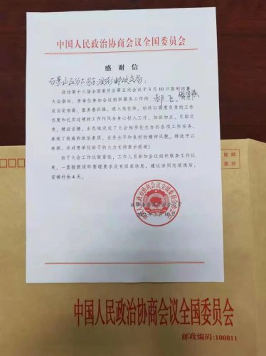 3月10日,中國人民政治協(xié)商會議全國委員會辦公廳向石景山區(qū)分公司寄來感謝信,對郵政兩會服務(wù)工作給予充分肯定和衷心感謝。信中表示,石景山區(qū)分公司郝飛、張宇燕同志在大會期間加班加點,恪盡職守、熱情服務(wù),出色地完成大會秘書處交辦的各項工作任務(wù)。