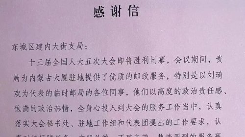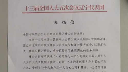 遼寧代表團(tuán)在感謝信中提到,“建內(nèi)大街支局秉承‘人民郵政為人民’的服務(wù)宗旨,為廣大代表提供了優(yōu)質(zhì)、高效、務(wù)實的用郵服務(wù)和豐富的郵政產(chǎn)品,受到了與會代表和工作人員的認(rèn)可和贊許,投遞員清晨就將當(dāng)天的會議用報及郵件送到駐地,保證了時限。在此向中國郵政致以誠摯的感謝,并提出表揚!”