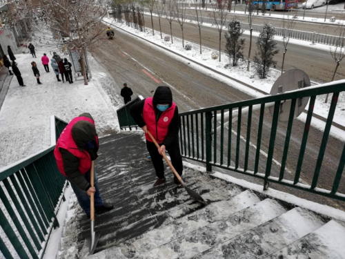 清雪過程中,志愿者們不懼嚴(yán)寒、揮動掃把、拿起鐵鍬,在街路、天橋、小區(qū)、廣場等地除雪除冰。雖然室外天寒地凍,但他們熱情高漲、干勁不減,用實際行動踐行著為民服務(wù)的熾熱情懷。同時,廣大志愿服務(wù)團隊還廣泛宣傳、動員市民積極行動起來,將自家周邊的積雪清理干凈,并勸導(dǎo)老人、兒童暴雪天氣非必要減少外出,讓市民群眾切實感受到志愿服務(wù)的溫暖。