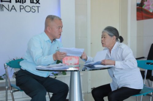 9月23日,《中國人大》記者在江蘇省泰興市郵政分公司江平路支局實地采訪何健忠代表。圖為何健忠(左)在支局開設的全國人大代表工作室接待來訪群眾,盡力幫他們排憂解難。