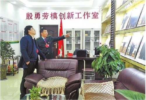 殷勇(右)向時任泗洪縣檢察院檢察長介紹“殷勇勞模創(chuàng)新工作室”,并對檢察工作建言獻(xiàn)策