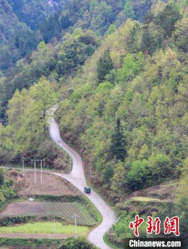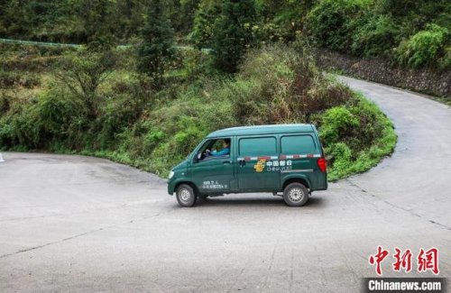 貴州省施秉縣白塘村的山路上,朱正琴駕車在投遞途中?!∧ス鹳e 攝