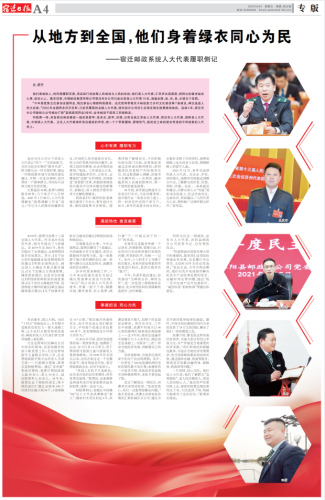 他們是郵政人,傳民情履職盡責(zé),用實際行動詮釋人民郵政為人民的宗旨;他們是人大代表,匯民聲共商國是,把群眾的需求裝在心里、放在心上。截至目前,中國郵政集團(tuán)有限公司宿遷市分公司已走出各級人大代表10名,涵蓋全國、省、市、縣、鄉(xiāng)鎮(zhèn)五個層面。