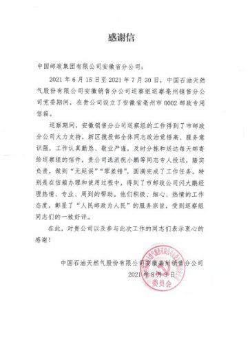 今年8月份,亳州市分公司還收到了來自中國石油天然氣股份有限公司安徽亳州銷售分公司的感謝信,感謝亳州市分公司在安徽銷售分公司巡察期間提供的高質(zhì)量郵政服務(wù)。