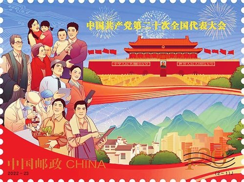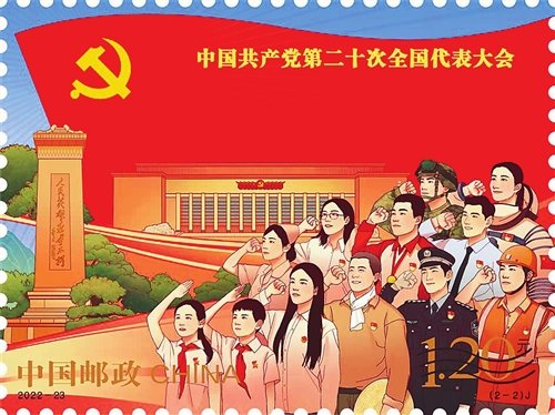中國郵政定于2022年10月16日發(fā)行《中國共產黨第二十次全國代表大會》紀念郵票一套2枚、小型張1枚。郵票第一圖名稱為“奮進新征程”,第二圖名稱為“建功新時代”,小型張圖案名稱為“慶祝中國共產黨第二十次全國代表大會勝利召開”。全套郵票面值為8.40元。郵票計劃發(fā)行1390萬套,小型張計劃發(fā)行790萬枚。