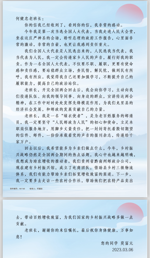 “人民代表人民選,我當(dāng)代表為人民;人民郵政為人民,干好本職為人民?!焙谓≈蚁M@兩封信能如同接力棒,將郵政人的為民情懷、人民代表的職責(zé)使命傳遞下去。