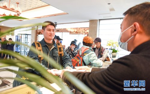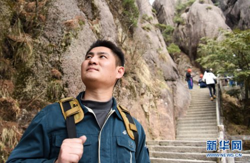 3月16日,休息間隙,謝菲俊放下郵包,一邊擦汗一邊欣賞黃山美景。