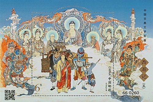 該套郵票是中國郵政自2015年發(fā)行的《中國古典文學(xué)名著——〈西游記〉》系列郵票的第五組,描繪了小說第七十四回至第一百回的五段故事場景。4枚郵票分別表現(xiàn)的是,孫悟空在獅駝嶺大戰(zhàn)青毛獅子、黃牙老象、大鵬雕三怪時激烈的打斗場景;孫悟空、豬八戒為救助被當(dāng)作藥引的比丘國眾孩童,在南極仙翁幫助下收服白鹿精、擒殺白面狐貍的場景;哪吒隨孫悟空去陷空山無底洞,擒獲欲強(qiáng)迫唐僧成親的金鼻白毛老鼠精的場景;孫悟空領(lǐng)著月宮主人太陰星君來到天竺國,收服假冒公主的廣寒宮搗藥玉兔的場景。小型張表現(xiàn)了師徒四人和白龍馬取回真經(jīng)后,真身返回靈山,終成正果的場景。畫家運(yùn)用傳統(tǒng)工筆重彩的手法,同時注重以形寫神,人物刻畫逼真?zhèn)魃?,在方寸間生動地演繹出大家熟知的故事情節(jié)。