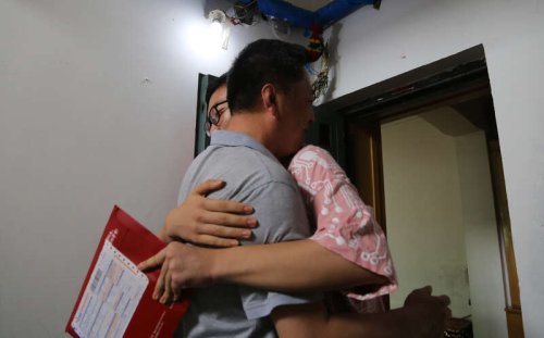 王曉宏將國科大本科生錄取通知書郵件送到王鶴鳴手中。受訪者供圖