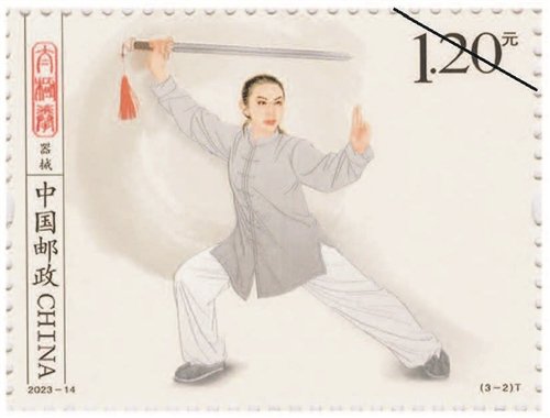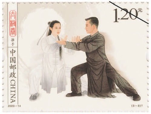 該套郵票一套3枚,圖案內容分別為拳術、器械、推手。郵票采用工筆人物形式表現(xiàn),整體色調以黑白灰為主,背景采用水墨飛白映襯太極拳平和、包容、大道至簡的意境。第一枚郵票表現(xiàn)了一位白發(fā)長須老者,正氣定神閑地做著太極拳單鞭動作,體現(xiàn)出太極拳的傳統(tǒng)風范和延年益壽的作用。背景用揮灑自如的水墨筆觸和肌理來表現(xiàn),伴隨老者動作產生無形氣韻。第二枚郵票中是一位英姿颯爽的舞劍女子,背景中如影隨形的氣流若隱若現(xiàn),體現(xiàn)出太極劍行云流水的特點。第三枚郵票中是一對進行太極拳推手的男女青年,一男一女、一黑一白象征太極的陰陽相濟,背后的水墨肌理隱約形成陰陽的概念,刻畫出“陰陽太極本相隨、動靜虛實把手推”的場景。