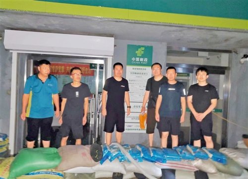 河北省涿州市郵政分公司搶險(xiǎn)小分隊(duì)用沙袋、防水塑料布在營(yíng)業(yè)廳、郵件處理中心門口圍擋防洪,開展搶險(xiǎn)救援?!鯊堄蠲?攝影報(bào)道