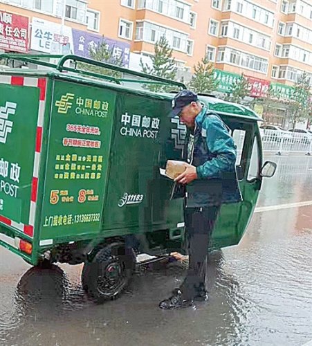 連日暴雨,路段積水,黑龍江省克東縣郵政分公司投遞員冒雨蹚水投遞?!踉S文佳 攝影報(bào)道