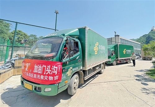 8月8日,北京市郵政分公司成立應(yīng)急運(yùn)輸團(tuán)隊(duì),為門頭溝區(qū)清水鎮(zhèn)政府運(yùn)送防汛救災(zāi)物資。□王宇萱 攝影報(bào)道