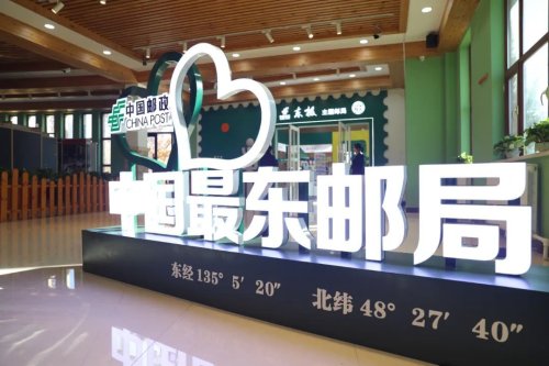 黑瞎子島位于我國最東端,是中國最早迎接太陽的地方,被列為國家級自然保護區(qū)?!皷|極”主題郵局位于黑瞎子島熊園游客服務(wù)中心,占地面積約50平方米,設(shè)有政務(wù)圖書展示、封片主題產(chǎn)品展示、有聲明信片打印、特色集郵產(chǎn)品展示、地方性農(nóng)特產(chǎn)品展示等10余個功能區(qū),并以紫氣東來、東極寶塔、黑熊、地標風景為元素,設(shè)計了18 枚紀念戳和37張主題元素明信片,以及魚皮畫和魚皮制品等地方性特色產(chǎn)品,為廣大游客提供多樣化的選擇。在服務(wù)中心廣場還設(shè)置了主題郵局吉祥物小熊“東吉吉”的異開筒,身高 3.2米的“東吉吉”憨態(tài)可掬,吸引眾多旅客駐足拍照,成為了一處獨具特色的打卡點。