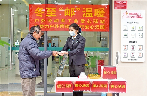 活動(dòng)現(xiàn)場,愛心驛站志愿者將準(zhǔn)備好的袋裝湯圓和驛站服務(wù)指南一一送到戶外勞動(dòng)者手中,并叮囑他們注意防寒保暖,用脈脈暖意幫他們驅(qū)散冬日的寒氣。