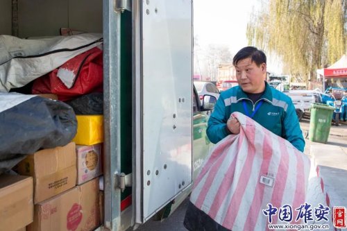 郭海玉正在將包裹搬上郵政車(chē)。中國(guó)雄安官網(wǎng)高盟 攝