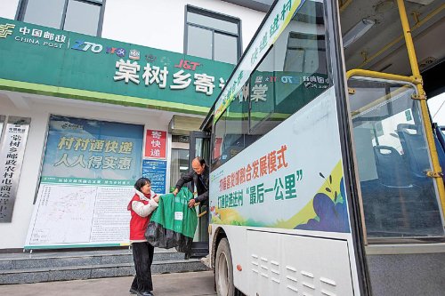 六安市舒城縣棠樹鄉(xiāng)寄遞共配中心開展“交郵合作”,工作人員將代運郵件交給公交車司機。(安徽省郵政分公司提供)