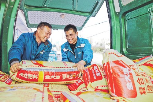 河南省駐馬店市遂平縣郵政分公司農(nóng)資配送員李華偉(右)和攬投員李勇一起,趕往陽豐鎮(zhèn)黑趙村綜合便民服務站,送去該村村民訂購的復合肥。店主張行夸獎道:“郵政服務好,配送及時,農(nóng)肥質(zhì)量有保證?!薄 踔袊]政報記者 賈紅偉 通訊員 李平 殷明珠 攝影報道