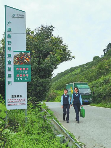陽朔縣郵政分公司員工來到白沙鎮(zhèn)古板水果專業(yè)合作社,上門了解金桔生長情況?! 踔袊]政報(bào)記者 呂文禮 攝
