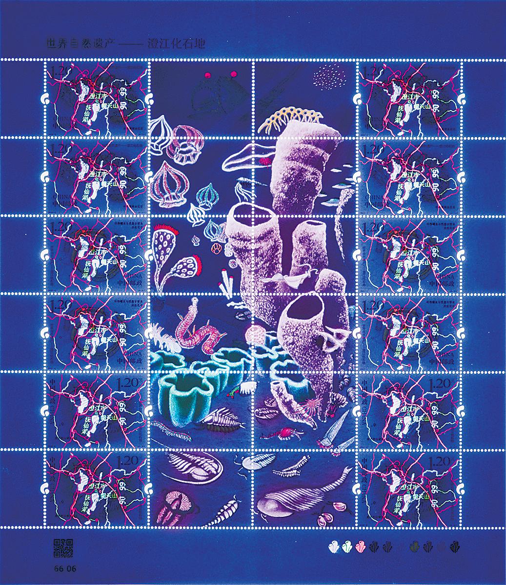 2024年是澄江遺址發(fā)現(xiàn)40周年,中國郵政在4月18日“世界遺產(chǎn)日”當(dāng)天發(fā)行《世界自然遺產(chǎn)——澄江化石地》特種郵票一套3枚。在郵票主圖中,設(shè)計(jì)師用彩鉛的手法繪制中華微網(wǎng)蟲化石、環(huán)飾蠕蟲與吸盤古宿蟲共生化石和延長撫仙湖蟲化石,并疊加澄江地圖;郵票附圖中不僅展示了三種化石的復(fù)原圖,更展示了多達(dá)37個(gè)古生物所組成的海底古生物群落的生活場景。