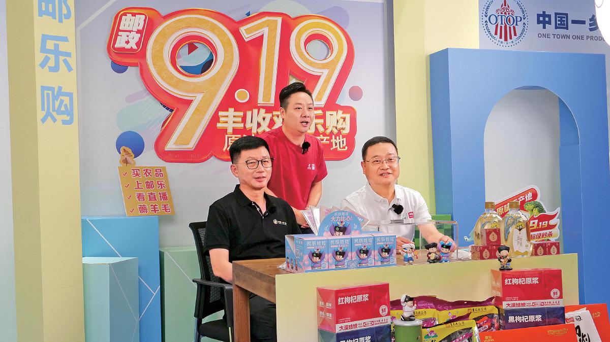 李唐(右)、中國民族貿(mào)易促進(jìn)會會長藍(lán)軍(左)走進(jìn)郵樂直播間為優(yōu)質(zhì)農(nóng)品“帶貨”。