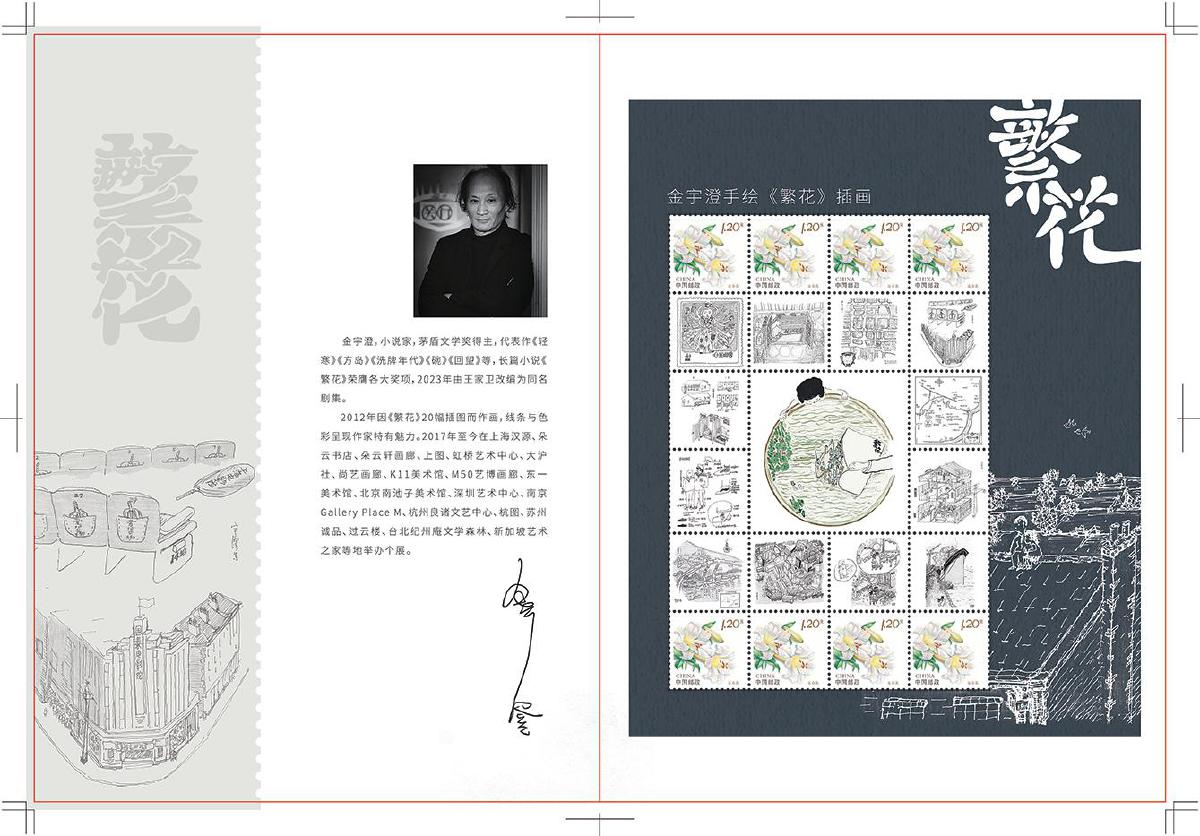 上海市分公司集郵與文化傳媒部集郵業(yè)務(wù)室項(xiàng)目負(fù)責(zé)人賈寅承擔(dān)著與金宇澄對(duì)接設(shè)計(jì)的工作。在數(shù)次的線(xiàn)上和線(xiàn)下聯(lián)系中,他感觸良多:“這次整體的溝通過(guò)程,讓我感受到了劇中經(jīng)常提到的‘不響’的處事態(tài)度?!睋?jù)賈寅回憶,金宇澄在雙方明確意向當(dāng)天,就對(duì)所有手繪插圖稿進(jìn)行整理,精心挑選出反映小說(shuō)中經(jīng)典瞬間和場(chǎng)景的13幅插畫(huà),隔天就提供給上海市分公司進(jìn)行設(shè)計(jì)制作,這種目標(biāo)清晰、悶聲做事、執(zhí)行高效的態(tài)度讓他印象深刻。對(duì)于圖稿的細(xì)節(jié),無(wú)論是字體還是顏色,金宇澄都一一斟酌、反復(fù)推敲,“‘繁花’二字與郵票邊框處銜接應(yīng)該是截平,而不是圓筆”“房子和屋頂是個(gè)標(biāo)志,盡量露出來(lái)”“郵票上的展現(xiàn)應(yīng)該比書(shū)本更精確”……賈寅感慨道:“從這數(shù)次溝通中,我感受到了他們這代人的郵票情懷,他們是真的懂集郵。我也感受到了他們高超的文化素養(yǎng)和審美水平?!?/p>