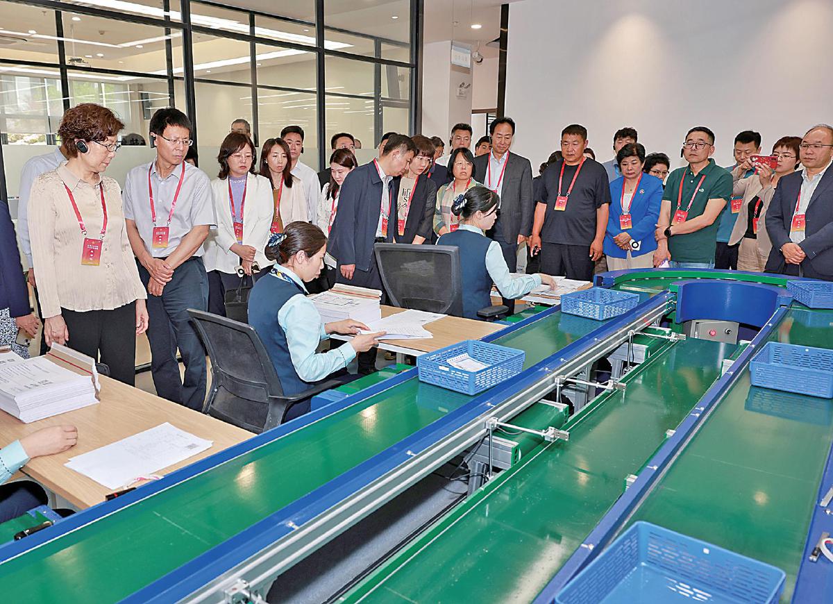 5月13日上午,來自北京、天津、河北、江蘇、山東5個省(市)的部分全國人大代表來到“江蘇法郵集約化服務(wù)中心”,先后視察法院集中送達中心、集中編目中心、12368訴訟服務(wù)熱線中心等工作區(qū)域,詳細了解了運營模式、服務(wù)流程、創(chuàng)新成效等。