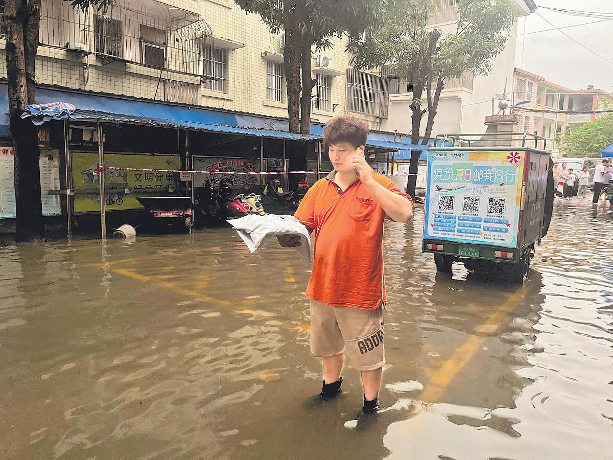 南寧市郵政分公司投遞員蹚著積水堅(jiān)持投遞。
