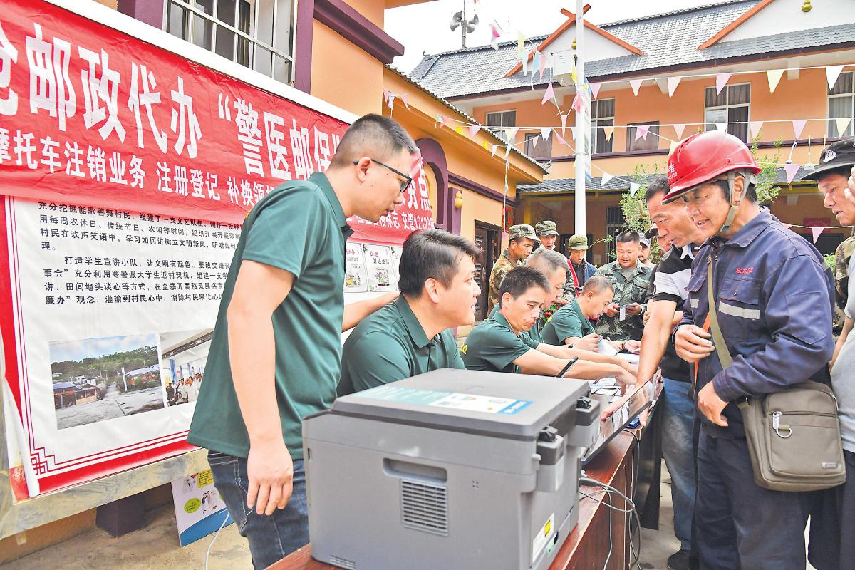 2023年7月,瀾滄縣分公司與縣公安局交通警察大隊(duì)聯(lián)合啟動(dòng)“警醫(yī)郵?!表?xiàng)目服務(wù)并將其下沉至邊境村寨,開(kāi)展流動(dòng)服務(wù),既方便村民在“家門(mén)口”辦理業(yè)務(wù),又通過(guò)線(xiàn)下宣傳提升村民交通安全意識(shí),減少交通事故發(fā)生。廣場(chǎng)一角,鮮紅醒目的“警醫(yī)郵保臨時(shí)服務(wù)點(diǎn)”橫幅拉起,兩張長(zhǎng)桌合并擺放整齊,郵政工作人員一字排開(kāi)、分工操作,熱情地接待每一位村民。一個(gè)熟悉的身影出現(xiàn)在人群中,李永梅打著電話(huà),在村口與廣場(chǎng)之間忙前跑后。
