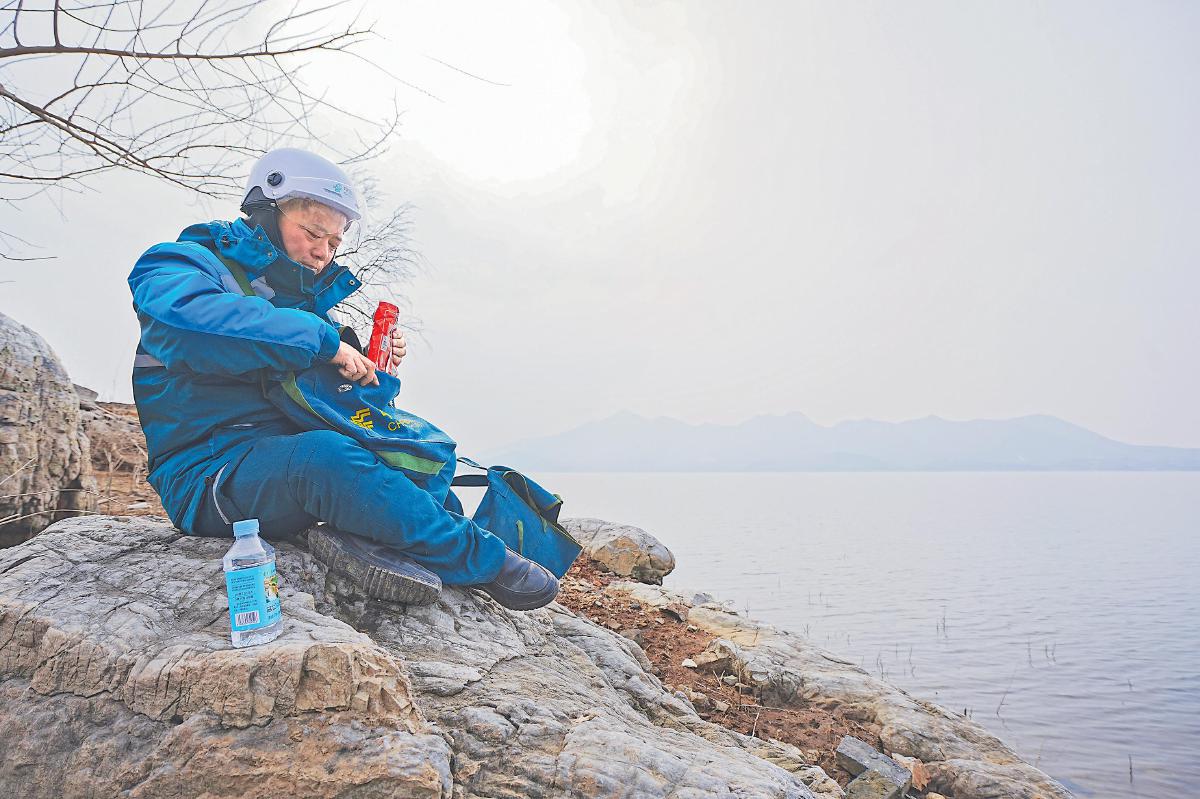 在等待渡船時(shí),石新國(guó)吃點(diǎn)干糧、喝點(diǎn)水?!±钇健z