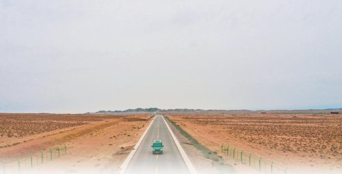 在從明水村返程的郵路上,在馬鬃山的落日與晚霞中,路邊一株株芨芨草、駱駝刺格外挺拔,迎風抖動。一輛在風沙中疾馳的綠色郵車,配上駕駛室里橙衣綠褲、英姿颯爽的“牡丹花”,成就了瀚漠中的最美風景。