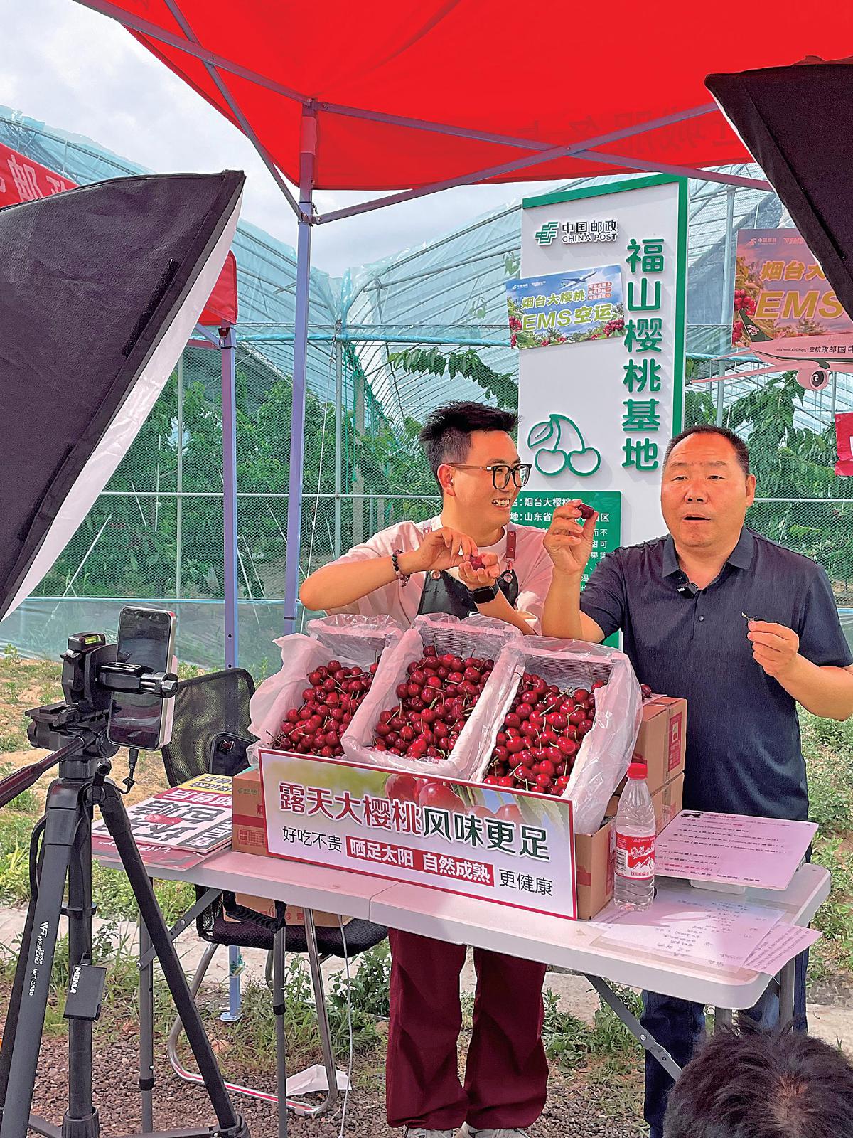 郵政員工與當(dāng)?shù)睾献魃缲?fù)責(zé)人在大櫻桃基地進(jìn)行現(xiàn)場(chǎng)直播?! 趵铞I 攝