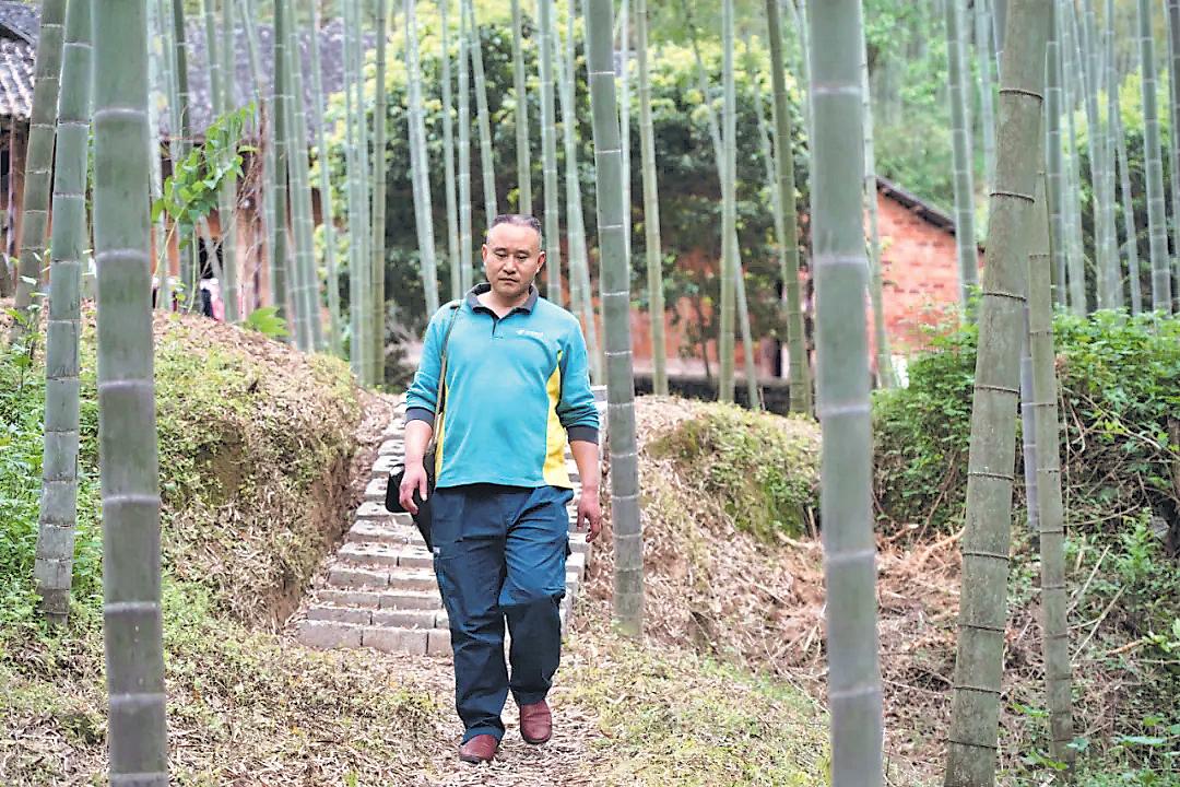 王天明背著郵包行走在鄉(xiāng)間小路上。