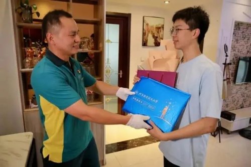 7月10日下午1點,2024年江蘇全省首封高考錄取通知書花落常州。中國郵政常州市分公司天寧攬投部投遞員、“常州市五一勞動獎?wù)隆鲍@得者徐大磊冒雨僅用20分鐘,將北京航空航天大學(xué)的錄取通知書送達(dá)考生賈沐洋手中,并向他表示祝賀。