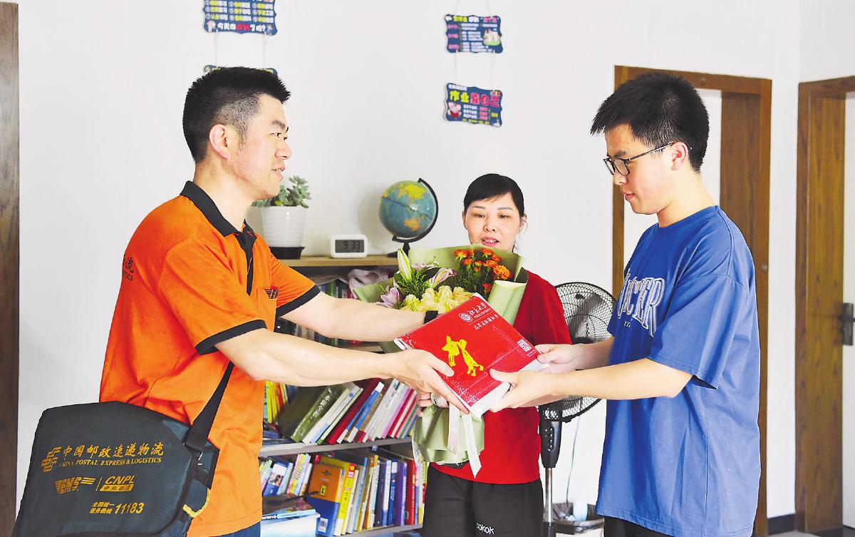 7月21日上午,浙江省永嘉縣郵政分公司員工王小蒙為兒子王傳祈送上北京大學(xué)錄取通知書(shū)。收到父親送來(lái)的錄取通知書(shū),王傳祈很激動(dòng),感謝父親以辛勤的工作為自己樹(shù)立了榜樣,表示上大學(xué)后要繼續(xù)努力學(xué)習(xí),以?xún)?yōu)異的成績(jī)回報(bào)父母。王小蒙參加郵政工作已有16年,送了很多件高考錄取通知書(shū),這是他最幸福、最特殊的一次投遞。他希望兒子今后用所學(xué)的知識(shí)為國(guó)家貢獻(xiàn)自己的一份力量。