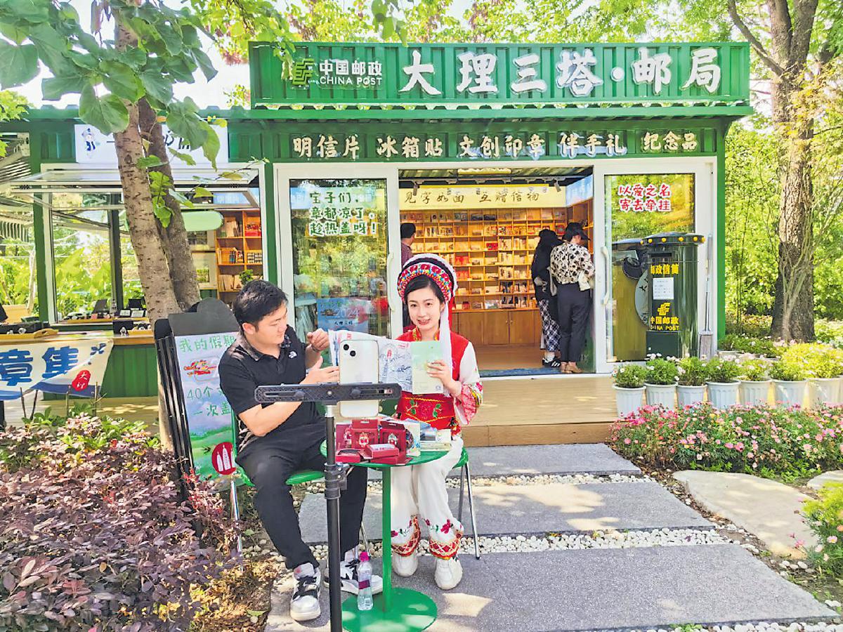 “我在網(wǎng)上刷到三塔主題郵局,所以來這里蓋印章。順著印章順序打卡游覽三塔,是我此次旅途中必須完成的一個項目。”暑假期間,來自安徽的游客王女士期待地說。近兩個月來,大理三塔主題郵局迎來旺季人流高峰,平均每天客流量超8000人,主題郵局內(nèi)的文創(chuàng)產(chǎn)品也受到游客的追捧。
