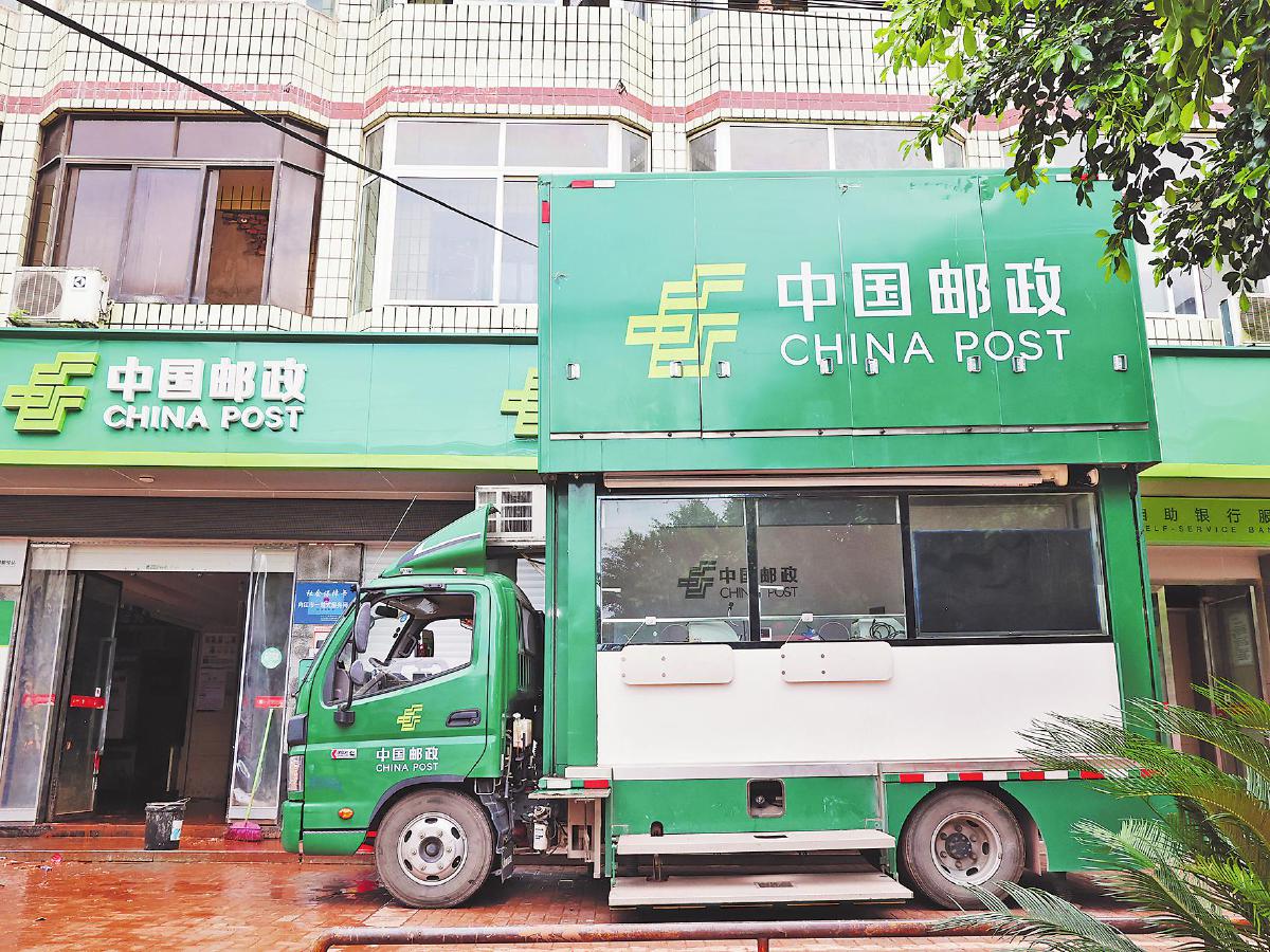 洪水退去后,四川省內(nèi)江市郵政分公司配備移動服務(wù)車,第一時間恢復(fù)業(yè)務(wù)辦理。