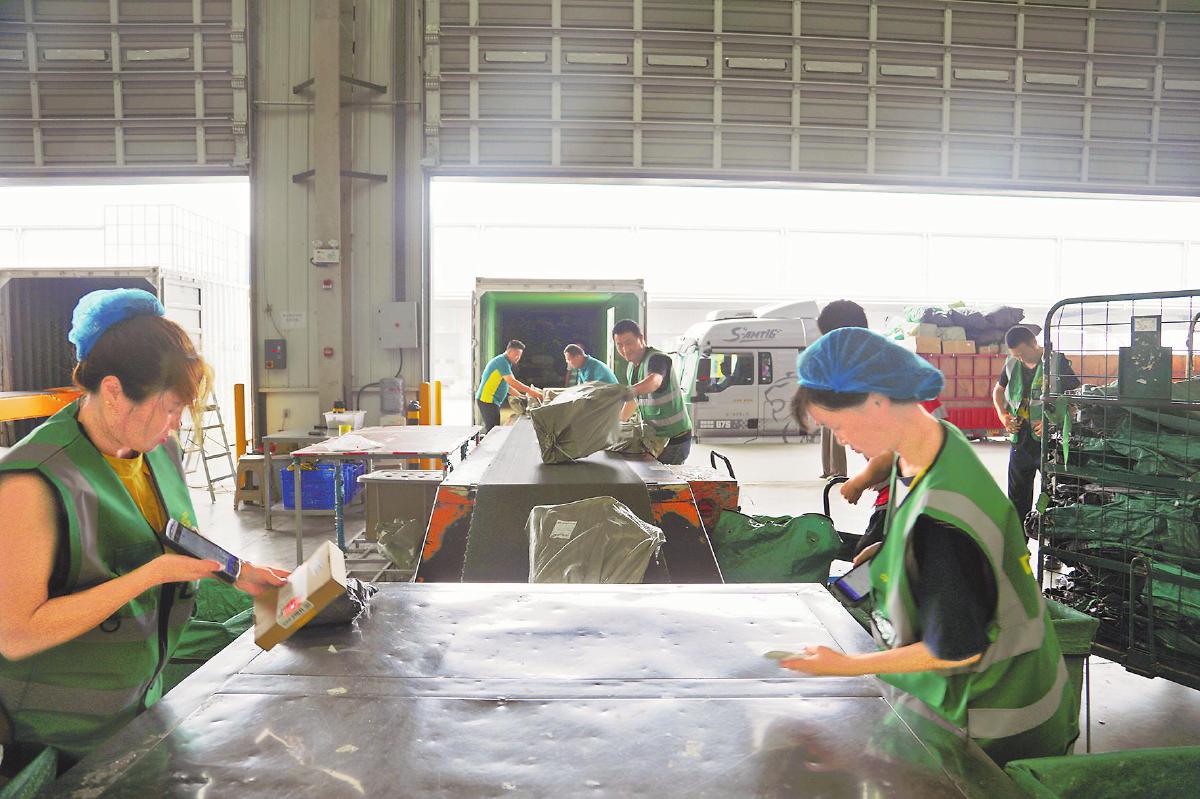 陜西郵政工作人員在倉儲中心處理發(fā)往新疆的郵件。 □姚海龍 攝